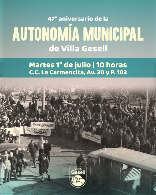 El martes 1º de julio se celebrará el 47º aniversario de la autonomía de Villa Gesell con un acto protocolar que tendrá lugar a las 10:00 horas en el Centro Comunitario de La Carmencita, ubicado en Paseo 103 y Avenida 30. Se invita a participar a instituciones, pioneros y a toda la comunidad para conmemorar esta fecha tan significativa.