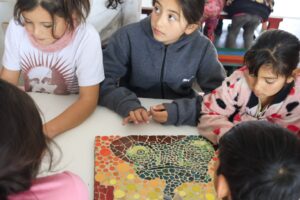 En este segundo encuentro, las niñas y los niños tuvieron la oportunidad de dialogar con Paloma Rodríguez, creadora de Ánima Délfica, quien compartió sus técnicas, procesos creativos y proyectos, y donó una de sus obras para embellecer el lugar. También estuvo presente la artista Melissa Sonnerborn, reconocida por su destacada labor en el arte del mosaiquismo.