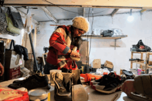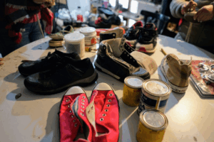 El taller, a cargo de la cooperativa, ofrece técnicas para el arreglo y mantenimiento de calzados, promoviendo además la sostenibilidad a través de la reparación y reutilización.