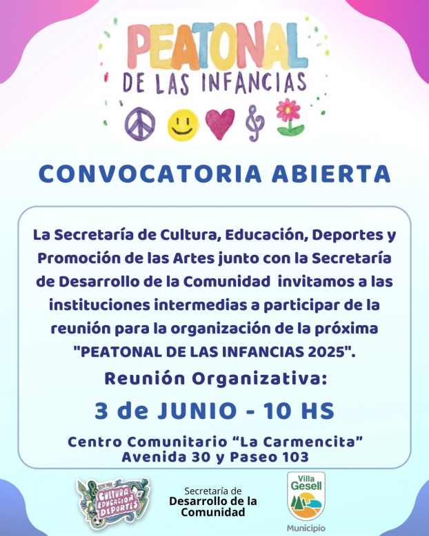 La Municipalidad de Villa Gesell invita a todas las instituciones intermedias a participar de la primera reunión organizativa de la segunda edición de la Peatonal de las Infancias 2025.