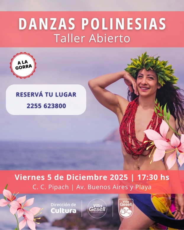 El viernes 5 de diciembre, el Centro Cultural Pipach recibirá un Taller de Danzas Polinesias, una propuesta artística coordinada por María Grasso, directora de la compañía Hokulani Ballet Polinesio. La artista ha compartido su trabajo en escenarios nacionales e internacionales, con especialización en danzas hawaianas, tahitianas y rapa nui, expresiones que transmiten la historia, la espiritualidad y la riqueza cultural de la región del Pacífico.