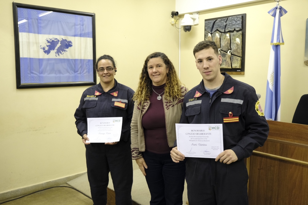 Melina Moncayo y Valentino Iriart fueron homenajeados por su destacada participación en las Olimpiadas de Destreza Bomberil realizadas en Córdoba, donde Melina se consagró campeona y Valentino obtuvo el subcampeonato.
