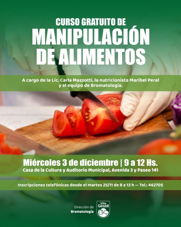 La Municipalidad de Villa Gesell informó que el próximo miércoles 3 de diciembre, de 9 a 12 hs, se realizará el último Curso de Manipulación de Alimentos del año. La capacitación tendrá lugar en la Casa de la Cultura y Auditorio Municipal.