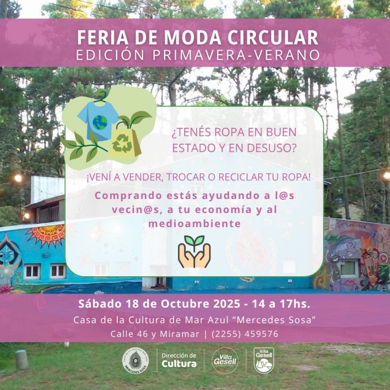 Este sábado 18 de octubre, la Casa de la Cultura de Mar Azul “Mercedes Sosa” invita a vecinas, vecinos y visitantes a participar de una nueva edición de la Feria de Moda Circular, una propuesta que combina sustentabilidad, arte y comunidad.