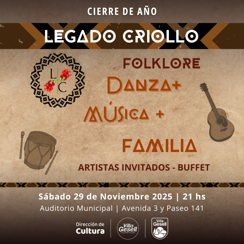 La Academia Legado Criollo, con la colaboración de la Dirección de Cultura, invita a la comunidad a disfrutar de una jornada dedicada a la música y la danza tradicional argentina, que se realizará el sábado 29 de noviembre de 2025, en el Auditorio Municipal, ubicado en Avenida 3 y Paseo 141.