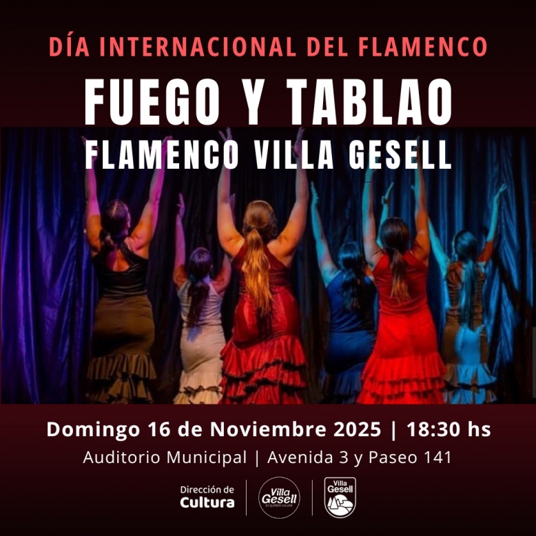 Este domingo 16 de noviembre, Villa Gesell se suma a la conmemoración del Día Internacional del Flamenco con una propuesta artística que tendrá lugar en el Auditorio Municipal. El espectáculo, titulado “Fuego y Tablao”, invita a celebrar esta expresión cultural reconocida en 2010 por la UNESCO como Patrimonio Cultural Inmaterial de la Humanidad.