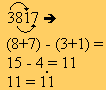 Un número es divisible por 11 cuando la diferencia entre la suma de los valores absolutos de las cifras de los lugares pares y la suma de los valores absolutos de los lugares impares, en el sentido posible, es múltiplo de 11 | ![]() |