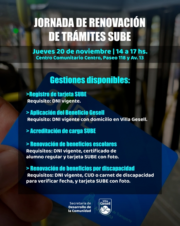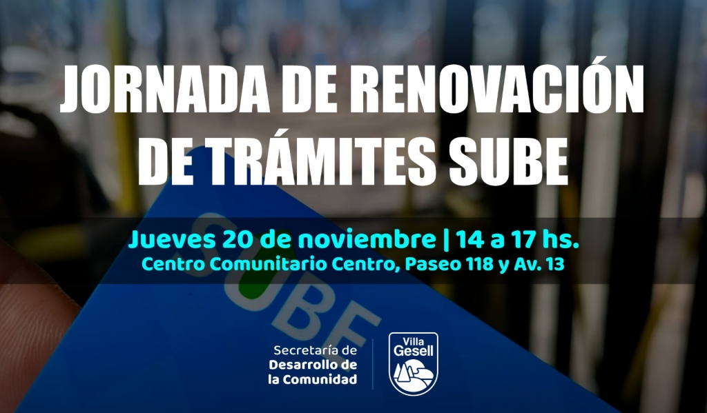 La Secretaría de Desarrollo de la Comunidad llevará adelante una jornada abierta destinada a que vecinas y vecinos puedan realizar diversos trámites vinculados a la tarjeta SUBE. La actividad se desarrollará el jueves 20 de noviembre, de 14:00 a 17:00 h, en el Centro Comunitario Centro (Paseo 118 y Avenida 13).
