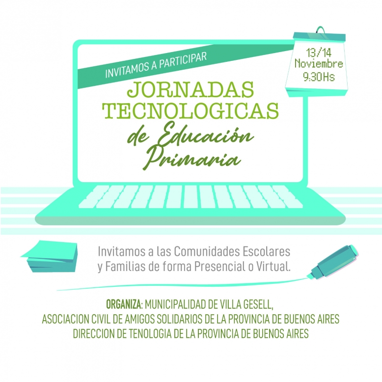 En el marco de la iniciativa “Inclusión del plan sin brech@ en la educación pública”, la Asociación de Amigos Solidarios de la Provincia de Buenos Aires, junto a la Municipalidad de Villa Gesell y la Dirección de Tecnología de la Provincia de Buenos Aires, invitan a la comunidad educativa y a las familias geselinas a participar de las Jornadas Tecnológicas de Educación Primaria, que se desarrollarán este jueves 13 y viernes 14 de noviembre, de 9 a 12 h y de 14 a 16:30 h, en el Hotel Intersur (Paseo 111 y Costanera).