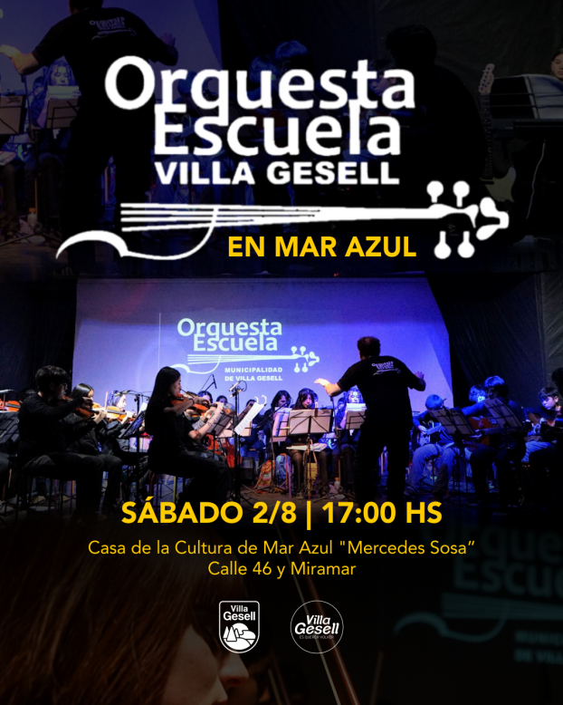 La Orquesta Escuela Villa Gesell ofrecerá un concierto el próximo sábado 2 de agosto a las 17:00 horas en la Casa de la Cultura “Mercedes Sosa” de Mar Azul, ubicada en calle 46 y Miramar.