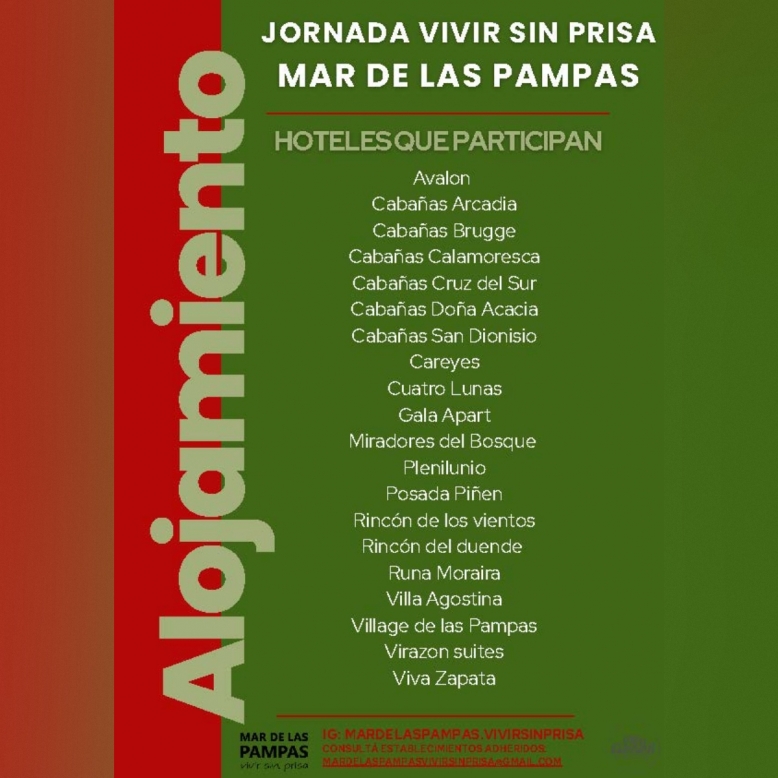 Entre los alojamientos adheridos se encuentran: Doña Acacia, Cruz del Sur, Posada Piñén, Calamoresca, Gala Apart, Plenilunio, Rincón de los Vientos, Brugge, Rincón del Duende, San Dionisio, Viva Zapata, Miradores del Bosque, Careyes Villa de Mar, Virazón Suites, Village de las Pampas, Runa Moraira y Avalon.