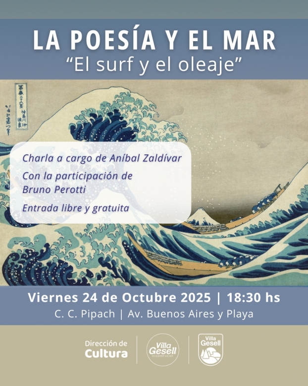 Este viernes 24 de octubre, el ciclo La Poesía y el Mar invita a un nuevo encuentro dedicado a los tópicos del surf y el oleaje. La actividad se desarrollará en su formato habitual, de un viernes al mes, en el Centro Cultural Pipach a las 18:30 h, con entrada libre y gratuita.