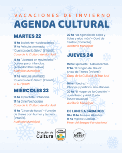La agenda cultural de Villa Gesell continúa ofreciendo una amplia variedad de espectáculos, talleres y actividades para todas las edades. Entre el martes 22 y el domingo 27 de julio, vecinos, vecinas y visitantes podrán disfrutar de funciones teatrales, títeres, cine, muestras artísticas y visitas guiadas al casco histórico.