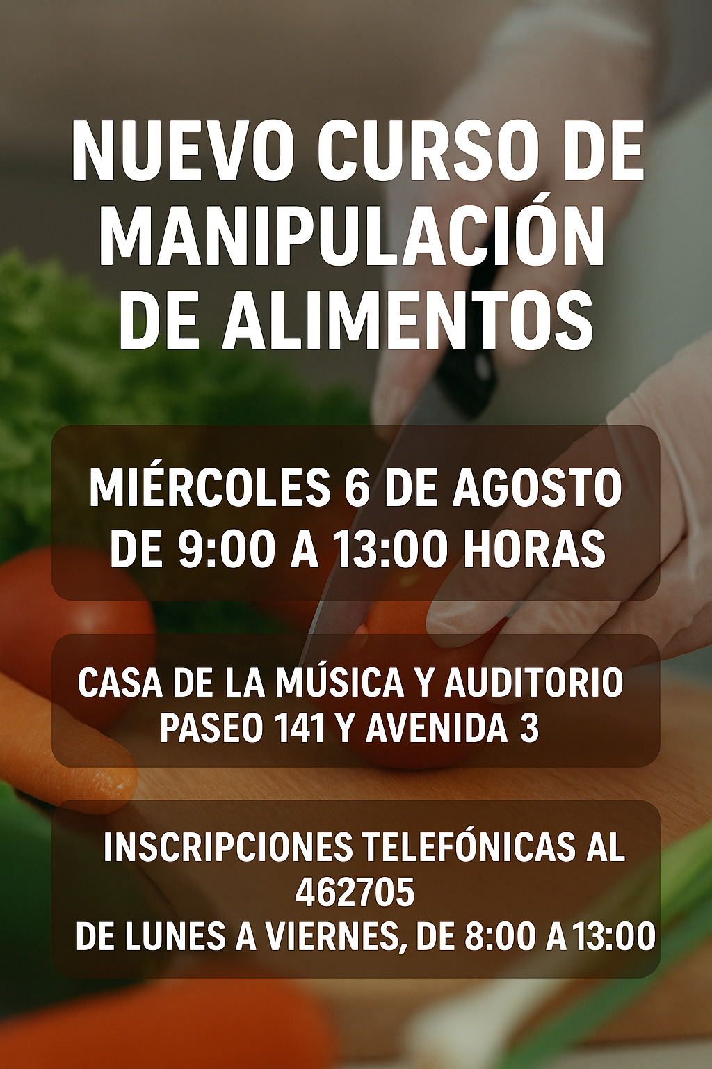 En el marco de la 29ª Fiesta Nacional del Chocolate Artesanal, la Dirección de Bromatología dictará un nuevo curso de manipulación de alimentos el próximo miércoles 6 de agosto, de 9:00 a 13:00 horas, en la Casa de la Música y Auditorio (Paseo 141 y Avenida 3).