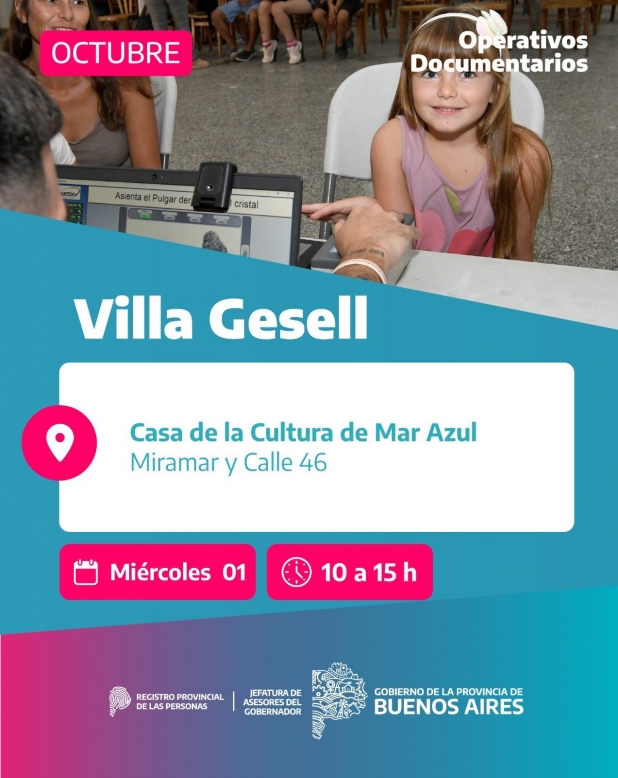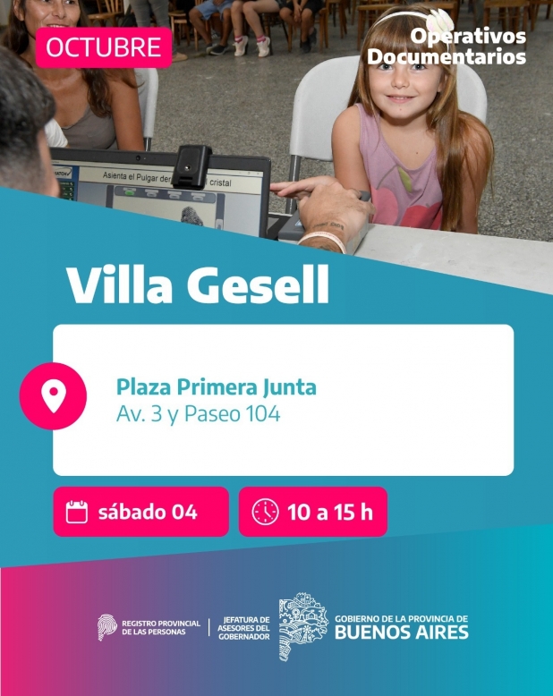 Del 1° al 4 de octubre, el Registro Provincial de las Personas, con el acompañamiento del Municipio de Villa Gesell, llevará adelante un operativo de documentación libre y gratuito en distintos puntos de la ciudad.
