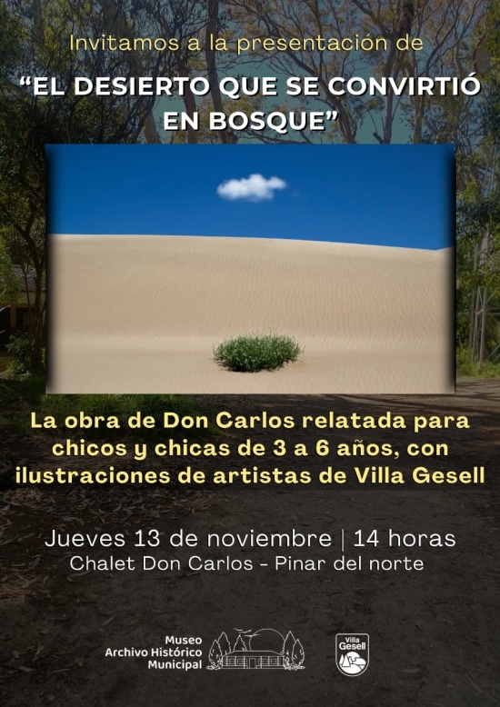 El Museo y Archivo Histórico invita a la comunidad a participar de la presentación de la obra “El desierto que se convirtió en bosque”, que se llevará a cabo este jueves 13 de noviembre a las 14:00 h en el Chalet de Don Carlos, ubicado en la Reserva Pinar del Norte.