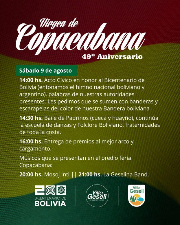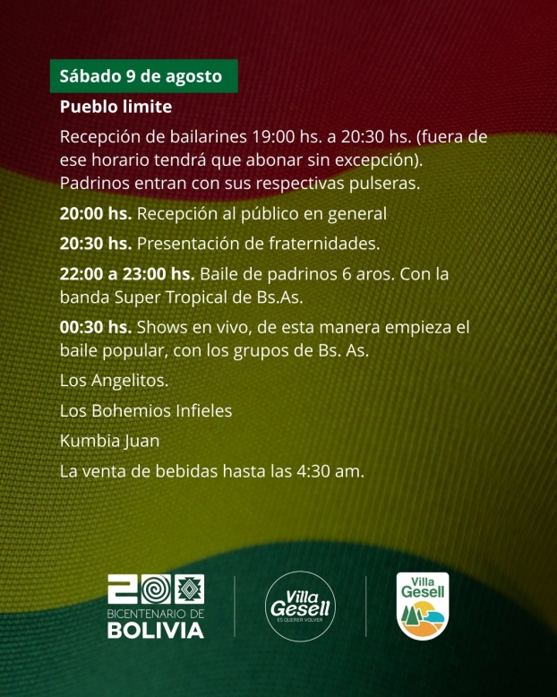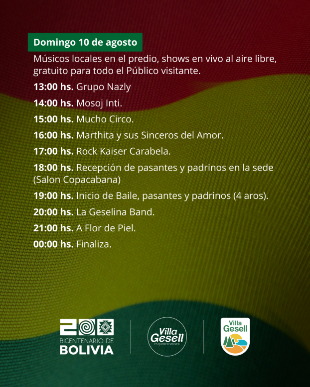 En Villa Gesell, las festividades organizadas por la Colectividad Boliviana se extenderán hasta el 10 de agosto, con diversas actividades culturales, religiosas y artísticas. Este año, la conmemoración se enmarca también en los 200 años de la independencia de Bolivia.