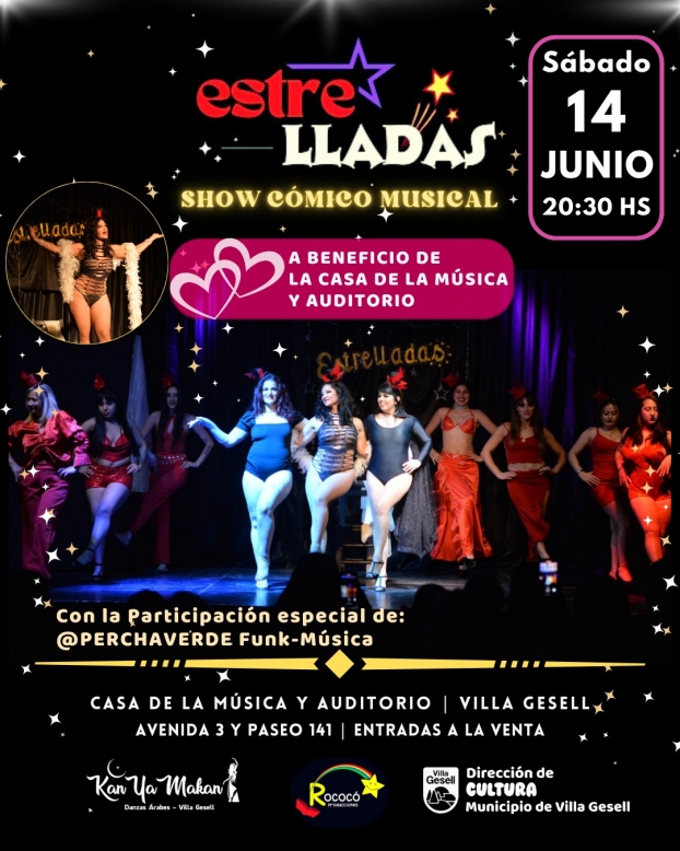 Este sábado 14 de junio a las 20:30 horas se presentará “Estrelladas”, un espectáculo de baile, canto y humor al estilo music hall, en la Casa de la Música y Auditorio Municipal, ubicada en Av. 3 y Paseo 141. La propuesta es impulsada por el Taller de Danzas Árabes Municipal y Rococó Producciones, con el objetivo de recaudar fondos para la remodelación de los centros culturales municipales.