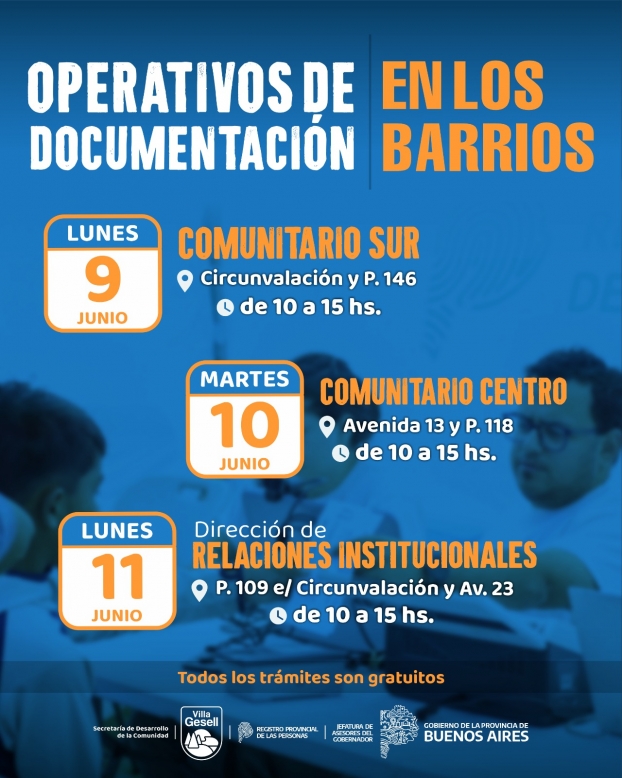 En el marco del programa de operativos documentarios del Registro Provincial de las Personas, dependiente de la Jefatura de Asesores del Gobernador, se llevarán a cabo tres jornadas gratuitas para la realización de trámites vinculados al Documento Nacional de Identidad y otras gestiones documentales, con el acompañamiento de la Secretaría de Desarrollo de la Comunidad de Villa Gesell.