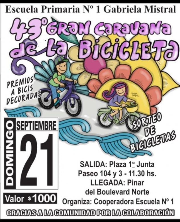 Como cada año, en el marco de los festejos por el Día de la Primavera, la Cooperadora de la Escuela Primaria N.º 1 “Gabriela Mistral” convocó a la comunidad geselina a participar de la tradicional caravana de la bicicleta, que se realizará el domingo 21 de septiembre a partir de las 11:30 horas.