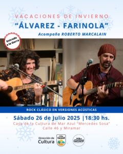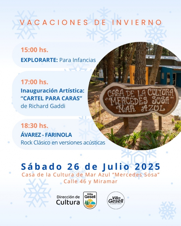 La Casa de la Cultura “Mercedes Sosa” de Mar Azul, ubicada en calle 46 y Miramar, presenta una agenda especial para disfrutar en familia durante las vacaciones de invierno. Este fin de semana, el espacio cultural ofrecerá talleres para infancias, una inauguración artística y música en vivo.