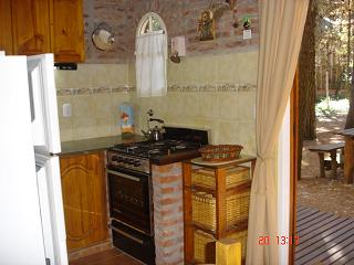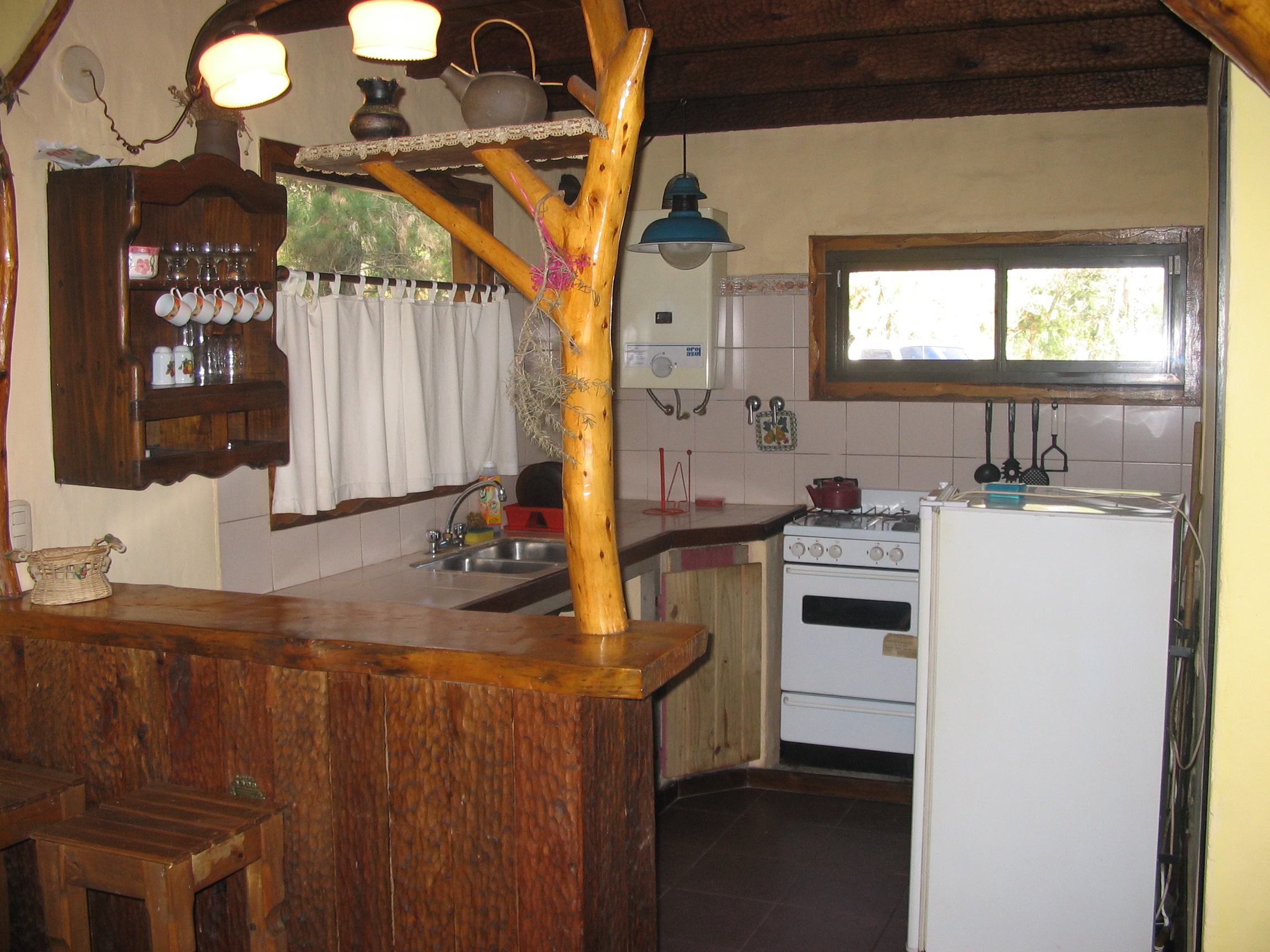 Cocina con desayunador, totalmente equipada, con heladera con freezer, microondas, cocina a gas, mesada de madera, vajilla completa, bat de cocina de acero, con tapas de vidrio, platos de madera para asado, vasos de diario, playa y licuado, copas de agua, vino y champagne, minipimer. Iluminacion con dicroicas.