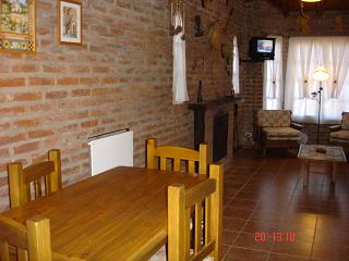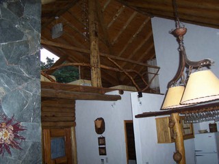 En la Planta baja, un living con enormes ventanales, sillon de tres cuerpos y dos de un cuerpo, con TV 20¨, y mesa ratona hecha con una rodaja de lanbertiana, separado del comedor, por un hogar a leña revestido en piedra, de doble boca, el comedor con mesa de tabla de madera rustica y sillas de tronco, muchos ventanales, las cortinas con bordado y flecos, muebles y artefactos de iluminacion, hechos artesanalmente.