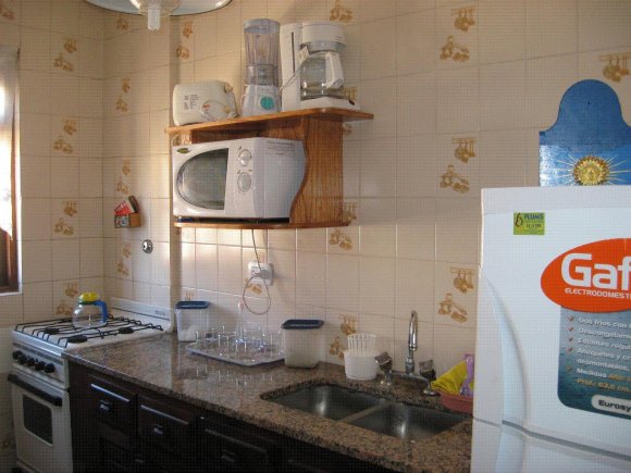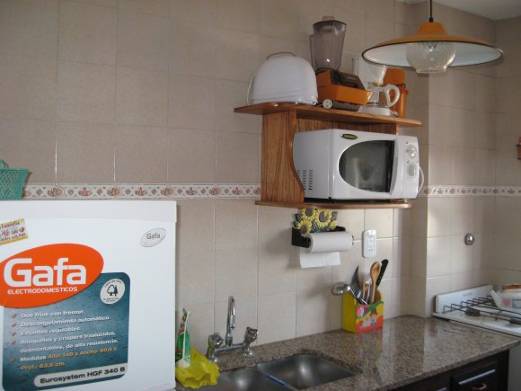 Cocina equipada con vajilla, cafetera, microondas.