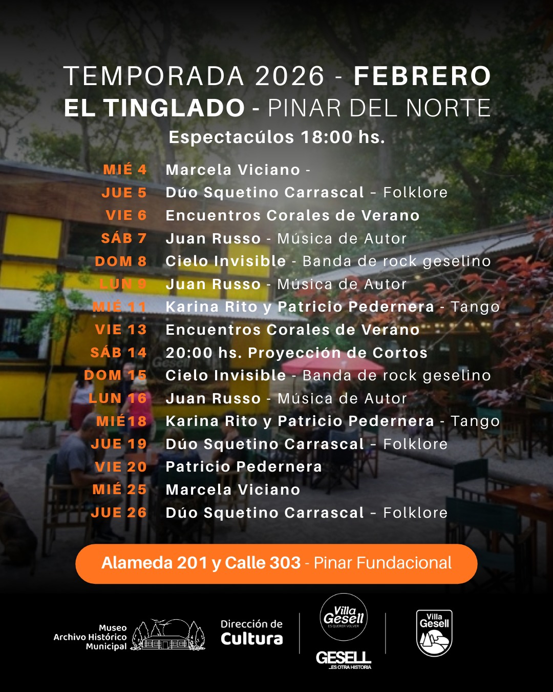 La Dirección de Cultura de Villa Gesell invita a la comunidad y a quienes visitan la ciudad a participar de una variada agenda de propuestas culturales durante el mes de febrero, con espectáculos en vivo y actividades vinculadas a la historia, la música y la identidad local, en el entorno del Bosque Fundacional.