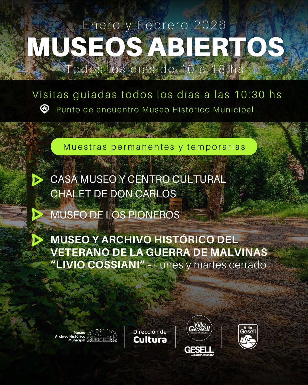 Los museos de Villa Gesell permanecen abiertos todos los días de 10:00 a 18:00 h, con visitas guiadas diarias a las 10:30 h, partiendo desde el Museo Histórico Municipal, además de muestras permanentes y temporarias que permiten recorrer la historia de la ciudad.