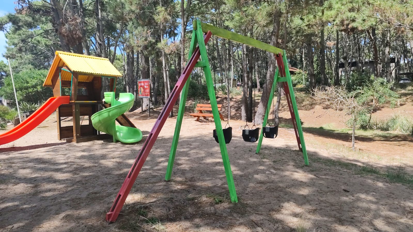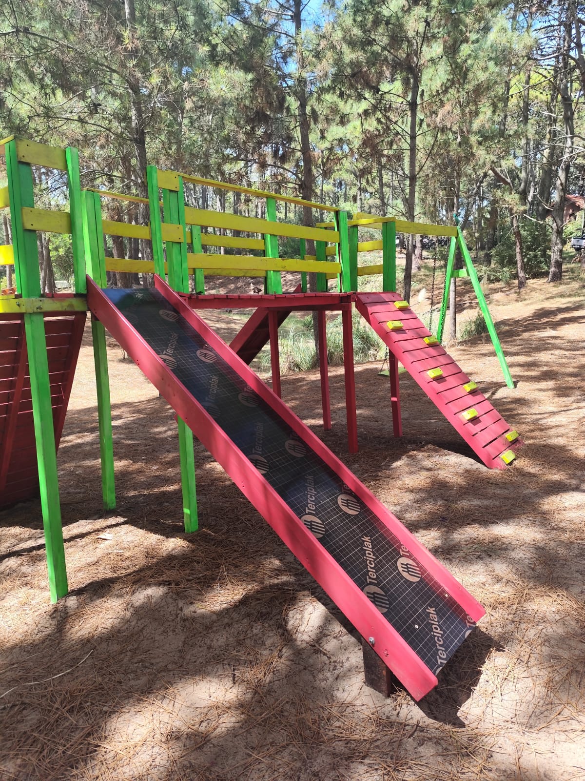 Los trabajos incluyeron la restauración integral de los juegos infantiles, incorporando mejoras estructurales, refuerzos de seguridad y renovación de superficies para garantizar condiciones óptimas de uso. Además, se realizaron arreglos en rampas, plataformas y sectores de trepado, junto con tareas de mantenimiento general orientadas a preservar el entorno natural que caracteriza a Mar Azul.