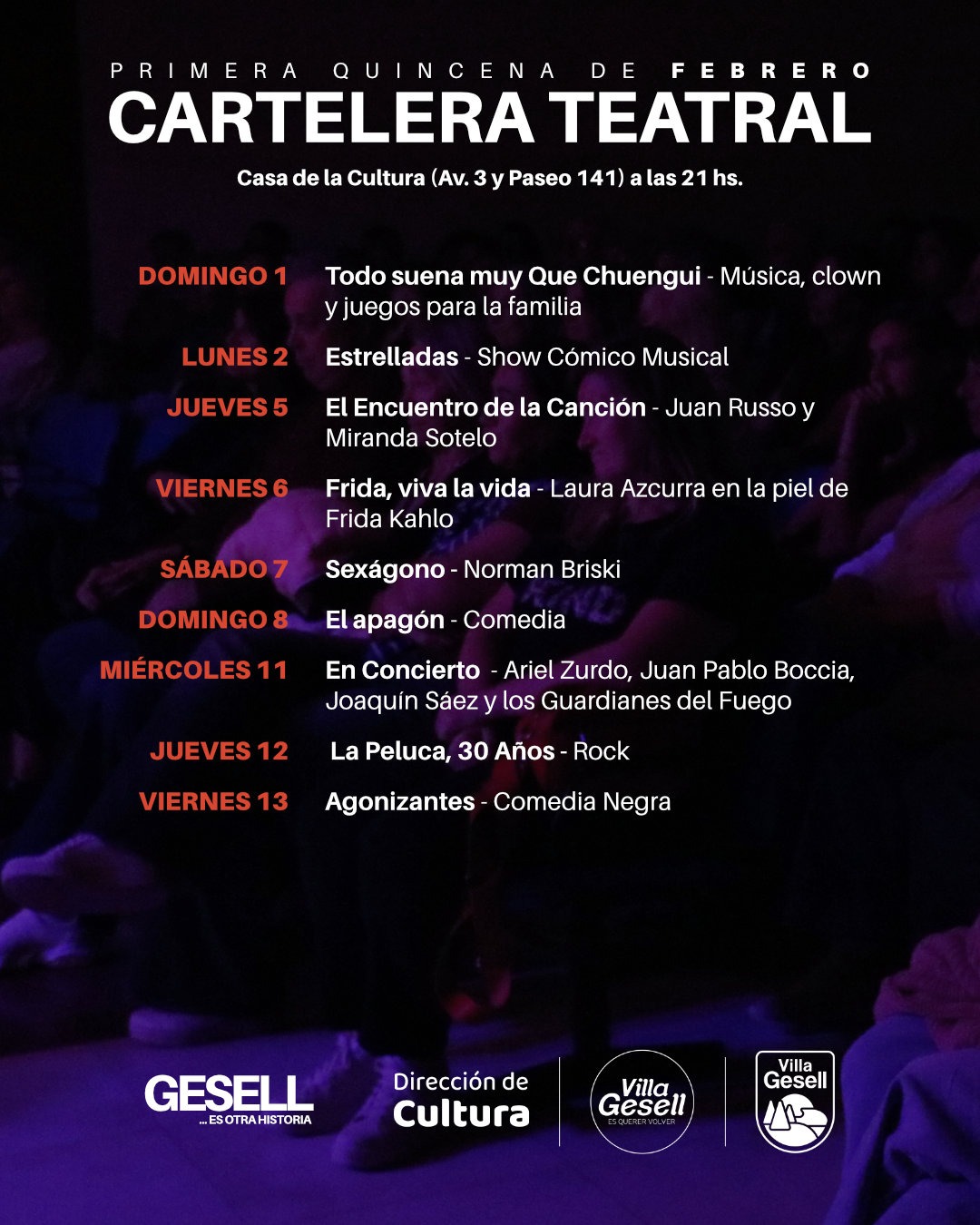 Durante el mes de febrero, la Casa de la Cultura y el Polo Cultural Sur presentan una variada programación de teatro, música y espectáculos destinada a toda la familia, consolidando al sur de Villa Gesell como un espacio de encuentro cultural durante la temporada de verano.